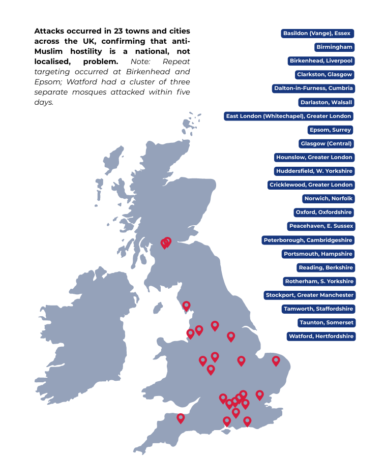 As the first official briefing since the BMT was appointed by the government to monitor anti-Muslim hate, the report recorded 27 verified attacks on 25 mosques across 23 towns and cities, spanning from Scotland to the south coast of England. Far from isolated incidents, the report concludes that the attacks formed part of an evolving national pattern that intensified over time—growing in both frequency and severity—and ultimately culminated in an arson attack with intent to endanger life.